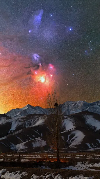 抬头远望,雪山巍峨,仿佛是大自然最纯净的守护神,静静俯瞰着这片沉睡的大地。就在这时,一抹不经意的生机跃入眼帘——一棵挺拔的孤树,在辽阔的雪原中倔强地站立,枝头竟藏着一个温馨的鸟窝!小小的生命迹象,在这浩瀚的白色世界里显得格外珍贵和温暖。深邃的蓝紫色天幕上,星星点点,天蝎座那标志性的曲线隐约可见,拉开了一幅奇幻序幕,宛如神秘画师不经意间洒落的璀璨颜料。雪山、田野、鸟窝与天蝎座调色盘的交织中,找到了属于自己的小小宇宙,感受到了大自然无尽的诗意与浪漫。