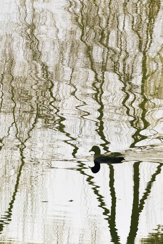湖心公园岸边的杨柳风姿绰约,青青枝条在春风中摇曳着,一只水鸟在湖面游弋,连同有些扭曲变形的柳树影迹,感觉如同一幅抽象画。