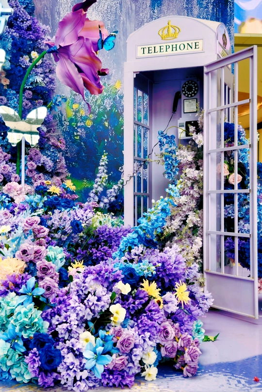 走进这梦幻一隅,淡紫色电话亭仿若童话入口。繁花如瀑倾泄,蓝紫交织,点缀着灵动蝶影。