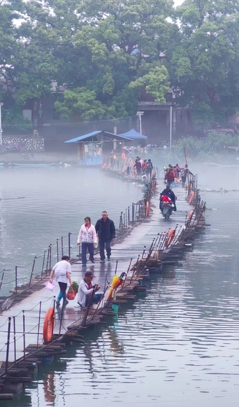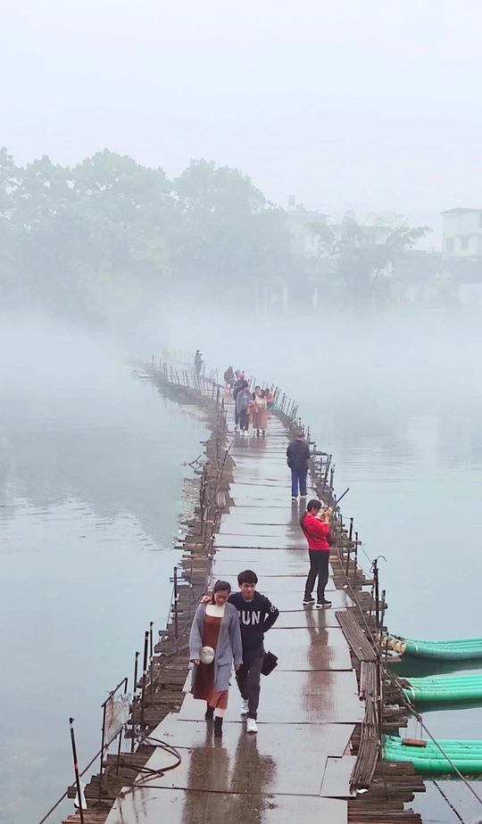 春天里,不止是春意盎然,还有烟雨蒙蒙。大雾过后,平流雾如碧玉腰带,镶嵌河岸。赶集的人在浮桥上在雾里在水上,两岸美景梦如幻,却充满人间烟火气!