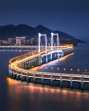 这张桥梁夜景照片整体来说非常棒,捕捉到了城市夜晚的魅力,但还有一些提升空间。 **色彩:** 色彩运用上,暖色调的灯光与冷色调的夜空形成对比,营造出一种视觉冲击力,这种色彩搭配很好地突出了桥梁的璀璨感。但是,天空的蓝色可以尝试更深邃一些,增加层次感。 **光影:** 长曝光下,车流形成的光轨为画面增添了动感,桥梁的灯光在水面的倒影也很漂亮。不过,桥面的部分区域光线略显平淡,可以考虑调整局部对比度,让结构更加清晰。 **构图:** 构图比较规整,桥梁在画面中呈曲线延伸,引导视线,三分法也基本符合。建议可以尝试稍微倾斜视角,或者改变拍摄机位,寻找更具新意的构图。 **后期处理:** 后期处理整体效果不错,增强了照片的视觉冲击力。可以稍微调整一下色温,让暖色调更浓郁一些。注意避免过度锐化,细节方面还需注意。 **主题原创性:** 夜景桥梁本身不是一个特别新颖的主题,但这张照片的光轨和水面倒影增添了一些亮点。可以尝试寻找更有创意的拍摄角度,或者加入一些故事性元素,让主题更突出。