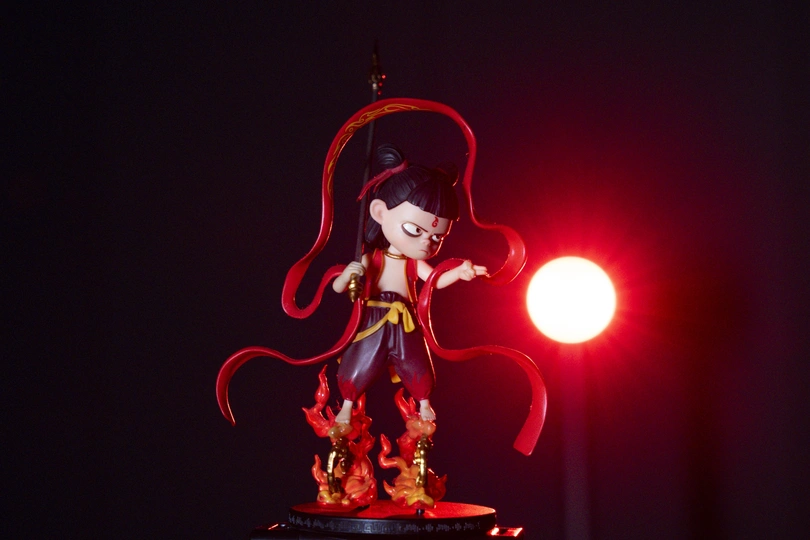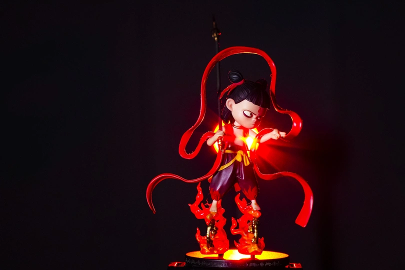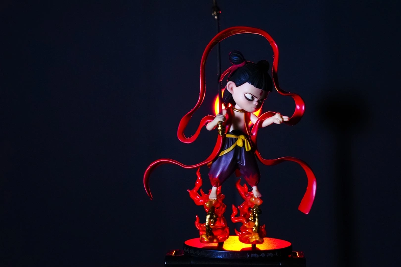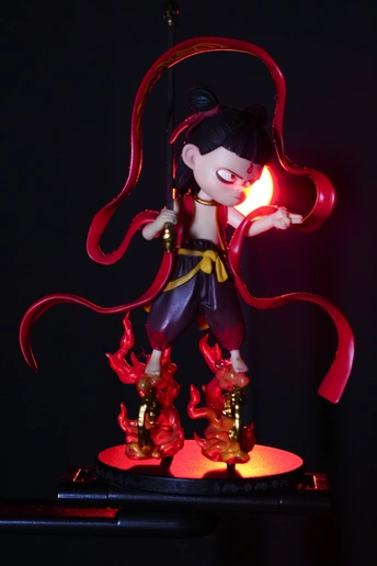 今天必须来给你们秀一秀我新入手的哪吒手办!这也太帅了吧? 整体造型动感十足,手里握着长枪,红色的混天绫肆意飞扬,仿佛下一秒就要冲入战斗。 脚下的风火轮栩栩如生,还有火焰特效,在灯光下显得格外逼真。而且哪吒的眼神超有气势,透露出一股不服输的劲儿。细节之处更是没得说,服饰的纹理都清晰可见。