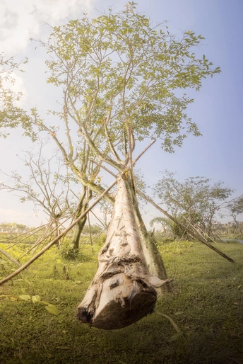 这张照片选择了一个独特的视角,仰视拍摄被支撑的树木,确实很有意思!但是,要让它更上一层楼,还得在细节上下功夫。 * **色彩:** 色彩整体偏暖,略微发黄,导致绿色不太鲜明。建议调整色温,让绿色更自然,蓝色更纯净。 * **光影:** 光线较为平淡,缺乏层次感。可以尝试在光线条件更好的时候拍摄,或者利用后期调整明暗对比,突出树木的纹理和结构。 * **构图:** 仰视构图本身是很有力的,但主体树干略微偏离中心,导致视觉重心不稳。建议调整拍摄角度或后期裁剪,让主体更突出。 * **后期处理:** 后期可以适度提高对比度和清晰度,增强细节表现。但要避免过度锐化,以免出现噪点。 * **主题原创性:** 保护树木的主题值得肯定。可以尝试不同的视角和构图,比如突出支撑架与树木之间的关系,让主题更鲜明。 * **情感共鸣:** 照片略显平淡,情感表达不够强烈。可以通过调整光影和色彩,营造更具氛围感的画面,引发观者的情感共鸣。 * **思想深度:** 照片反映了人们对树木的保护意识。如果能更深入地探讨人与自然的关系,或者引发对城市绿化的思考,将更具思想深度