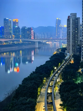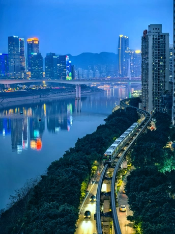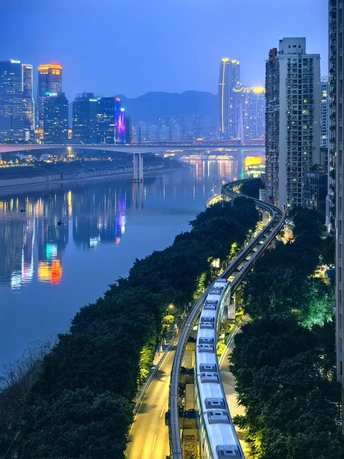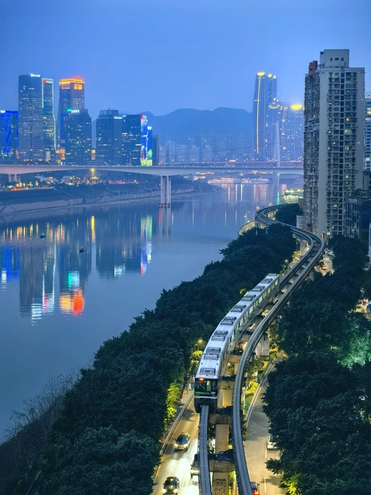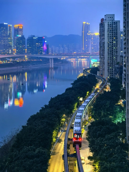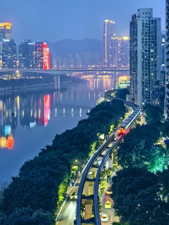 夜幕低垂,华灯初上,重庆这座山城在夜色中绽放出别样的魅力。嘉陵江畔,波光粼粼,倒映着两岸璀璨的灯火,宛如一幅流动的画卷,让人沉醉不已。而在这如诗如画的夜景中,S轻轨列车穿梭其间,成为了一道亮丽的风景线。S轻轨上的列车,宛如一条优美弧形的银色的绸带,列车缓缓行驶,车身上的灯光与周围的城市夜景交相辉映,构成了一幅动人心魄的画面,嘉陵江的夜景更是美不胜收,两岸的建筑在灯光的映衬下更显巍峨壮观。远处的山城灯火阑珊,近处的江面波光粼粼,仿佛整个世界都被温柔地包裹在这片光影之中。而S轻轨列车的出现,更是为这幅夜景增添了几分灵动与活力,也感受到了重庆这座城市的独特魅力,也让人们看到了现代都市与自然景观和谐共生的美好愿景。