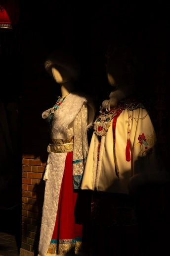 红绸与光影共舞,织就千年华章。 一袭烈焰灼岁月, 一裳霜雪映仙姿。 灯笼为幕,衣袂生辉, 愿人间烟火常伴—— 接財接福接平安。
