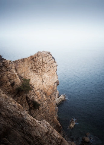 这张照片宛如一幅气势磅礴的自然画卷,将悬崖与大海的壮美展现得淋漓尽致。 画面的主体是一座巍峨的悬崖,褐色的岩石层层叠叠,尽显古朴与厚重。岩石表面纹理清晰,一道道沟壑仿佛是时光留下的深刻皱纹,诉说着千万年来的风雨洗礼。几株倔强的绿植,从岩石的缝隙中顽强生长而出,在冷峻的悬崖上点缀出几抹鲜活的翠绿,彰显着生命的坚韧与不屈。 悬崖之下,是深邃而辽阔的大海。海水呈现出一种静谧的深蓝色,与悬崖的褐色形成鲜明的色彩对比。海浪轻柔地拍打着崖壁和礁石,泛起层层白色的浪花,仿佛是大海与悬崖之间的低声细语。 远处的海天交界处,雾气朦胧,天空被渲染成淡淡的灰蓝色,给整个画面增添了一层神秘而悠远的氛围。这种朦胧感模糊了天与海的界限,使整个场景显得更加辽阔无垠,仿佛置身于一个与世隔绝的仙境。 这张照片不仅是对自然景观的捕捉,更是对大自然雄浑力量与宁静之美的生动诠释,让人在欣赏的同时,也能感受到内心的震撼与宁静。