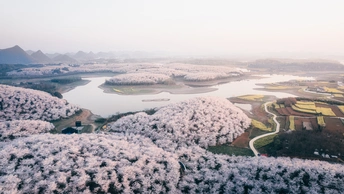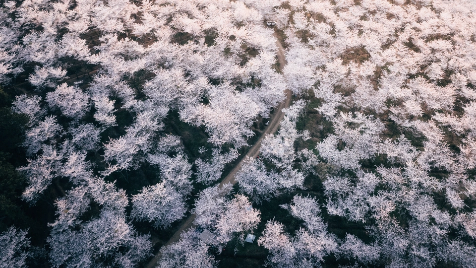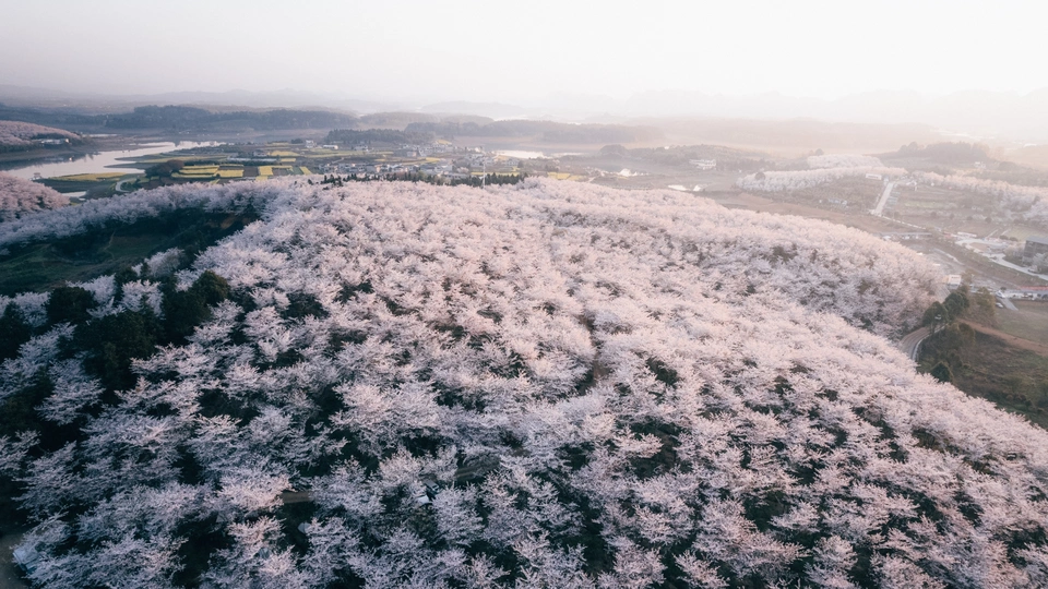 天光初破晓,樱林尚浸在青灰雾霭里。晨风裹着清寒掠过枝梢,惊起几粒颤巍巍的露珠,坠入满地落英铺就的浅粉绒毯。远处山脊刚镀上金边,霞光已顺着云层裂隙淌下来,将千万树樱花由淡粉染作浅红。薄雾游走林间,樱瓣如绡纱般透出朦胧珠光,露水在花蕊间凝成细碎虹彩。早起的白鹭掠过花海,翅尖沾着朝云,啼鸣震落簌簌香雪。晨光漫过观景台木栏时,整座樱园正裹着露湿的甜香苏醒,恍若浮在云端的粉色秘境,连呼吸都染着蜜色熹微。