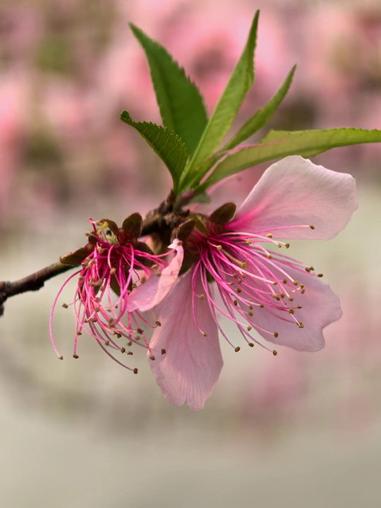 哈喽!咱们来聊聊这张桃花特写。整体感觉不错,粉嫩嫩的色彩很讨喜,背景虚化也到位,让花朵显得更突出。但就像谈恋爱一样,细节决定成败,咱们得精益求精! **色彩:** 粉色和绿色的搭配很经典,但粉色略显单调,缺少一些层次变化。背景的粉色如果能再柔和一些,与前景形成更好的呼应就更棒了。可以考虑后期稍微调整一下色阶,让粉色更有呼吸感。 **光影:** 光线比较柔和,但略显平淡,缺少一些戏剧性。建议可以尝试在侧光或者逆光条件下拍摄,这样能更好地展现花瓣的纹理和质感,也能营造更丰富的光影效果。 **构图:** 构图基本符合三分法原则,但略显居中。可以尝试稍微偏移一些,让画面更有活力。另外,可以考虑把花枝的一部分裁掉,突出花朵的细节,让画面更简洁。 **后期处理:** 后期处理整体比较自然,但可以适当增加一些对比度,让花朵更加鲜艳。注意不要过度锐化,以免产生噪点。 **主题原创性:** 桃花特写比较常见,但可以尝试从不同的角度和细节入手,展现桃花独特的美。比如,可以拍摄花蕊的细节,或者捕捉蜜蜂采蜜的瞬间。
