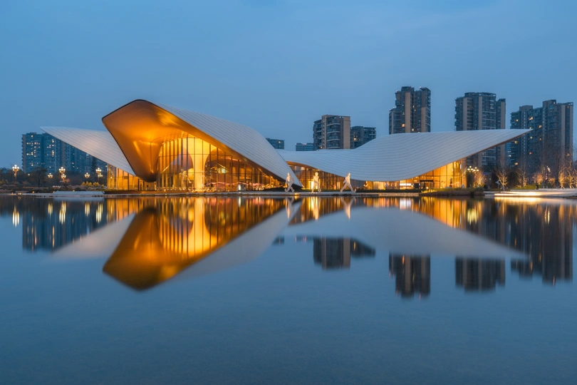 “天府锦绣,出水芙蓉”,傍晚蓝调时分开灯后的成都天府美术馆犹如绽开在水面的一朵芙蓉花.