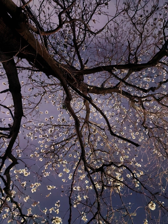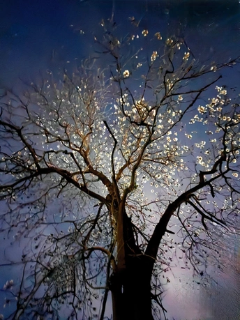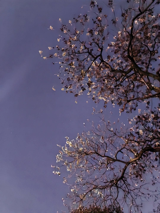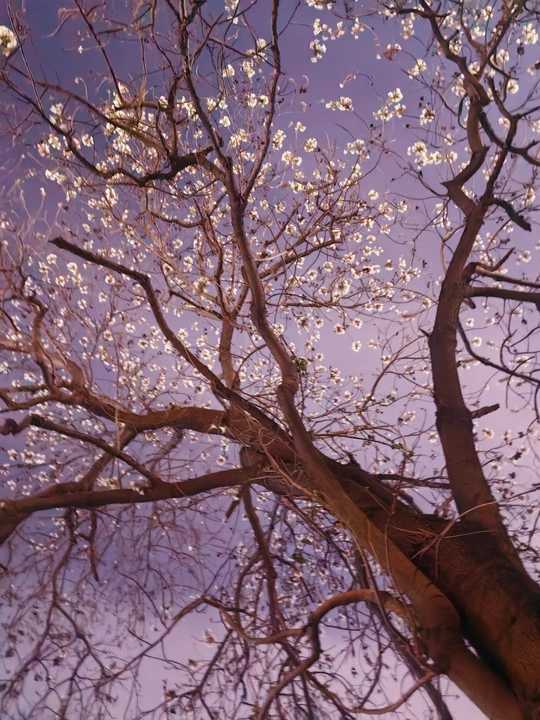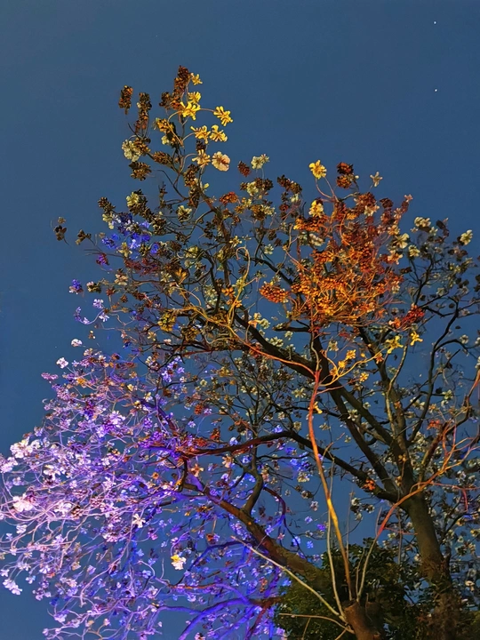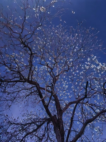 - 构图精妙:系列照片采用仰拍视角,以深邃夜空为背景,将树枝花朵置于画面中心,突出主体。枝干纵横交错,花朵疏密有致,形成自然且富有韵律的线条构图 ,给人视觉上的延伸感与张力。 - 光影巧妙:光线运用独特,部分花朵被光线照亮,明暗对比强烈。第二张照片中多彩光线为花朵增添梦幻氛围,另几张中微光勾勒花朵轮廓,增强立体感,营造出神秘静谧氛围。 - 色彩搭配:第二张色彩丰富绚丽,不同颜色光线交织,展现花朵多样色彩;其它几张以蓝紫色调为主,简洁纯净,突出花朵素雅之美,色彩选择契合不同氛围营造。