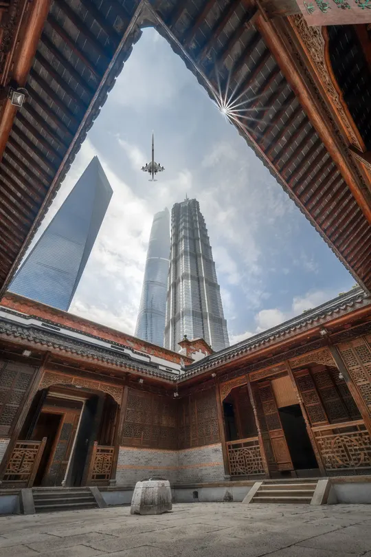 这张照片拍摄于上海市吴昌硕纪念馆,运用三阳14mm焦段镜头搭配coman零感zerox三脚架,以仰拍视角捕捉独特景致。通过针对暗部、中间调及高光区域拍摄三张照片,经后期HDR处理,巧妙融合传统与现代元素。古雅的中式建筑与背景中上海的摩天大楼相映成趣,空中飞机划过,展现时空交错之美,呈现出别具一格的视觉盛宴。