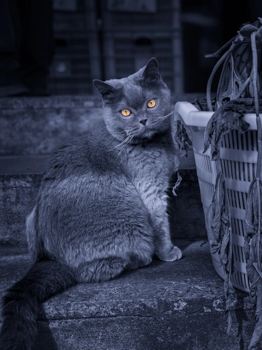 一只很壮实的蓝猫,在主人的水果摊前徘徊,守护这店老板一大框的西瓜,生怕别人买走。