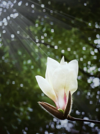 晨曦中,一朵洁白如玉的玉兰花静静绽放,花瓣舒展,柔美纯洁,惊艳了时光。