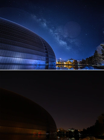 被光污染掩盖的美丽星空-国家大剧院2025年3月30日:这是长期摄影项目“被光污染掩盖的美丽星空”,每次提供两张照片,一张模拟现场肉眼看到的图景,一张用特殊的拍摄方法展现星空。