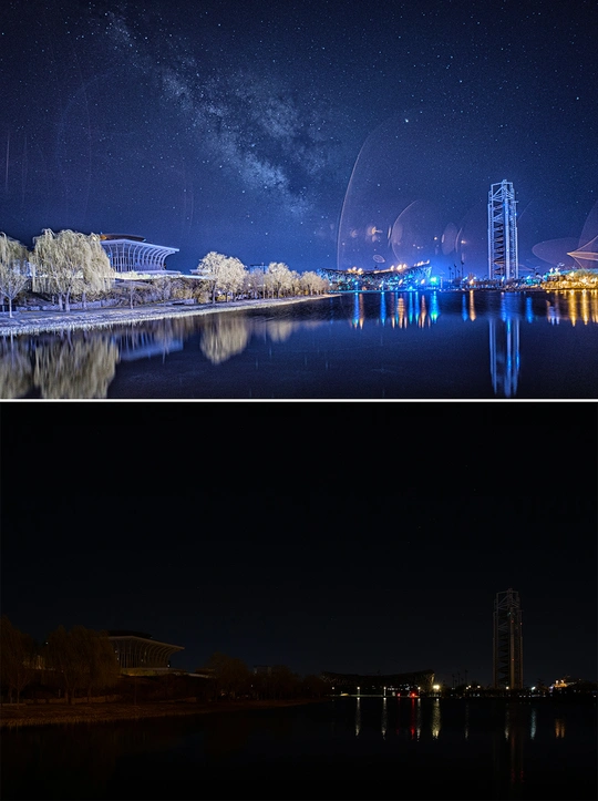 被光污染掩盖的美丽星空-鸟巢2025年4月2日:漫天的炫光下,依然有银河的身影,这或许是这个项目的部分意义吧。这天凌晨跑了好几个点,都因为炫光面积太大而放弃拍摄。这是长期摄影项目“被光污染掩盖的美丽星空”,每次提供两张照片,一张模拟现场肉眼看到的图景,一张用特殊的拍摄方法展现星空。