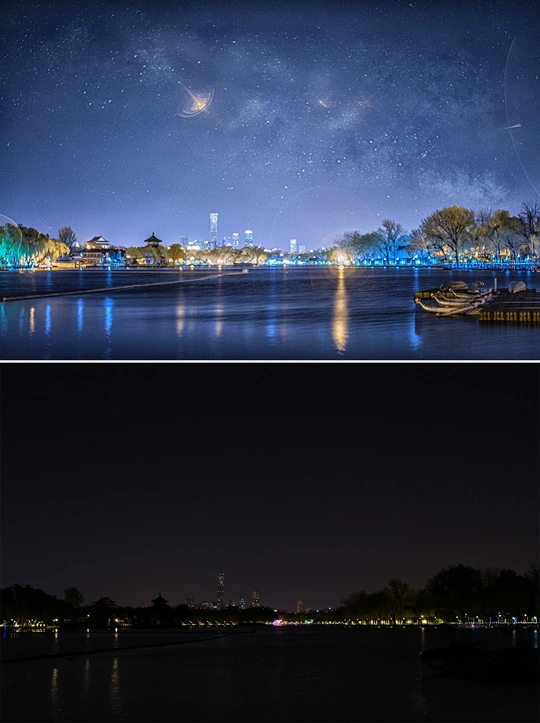 被光污染掩盖的美丽星空-北京天际线2025年4月5日:凌晨拍摄于什刹海后海,由于拍摄位置不很理想,再加上炫光的干扰,拍摄效果不是很好。这是长期摄影项目“被光污染掩盖的美丽星空”,每次提供两张照片,一张模拟现场肉眼看到的图景,一张用特殊的拍摄方法展现星空。