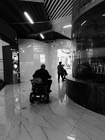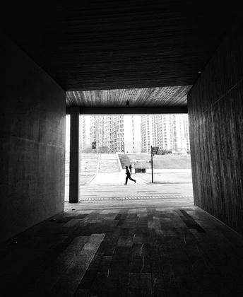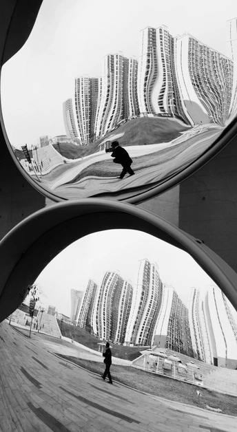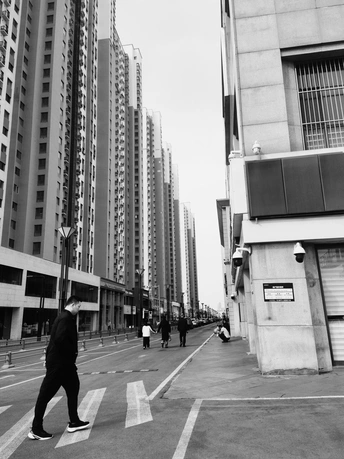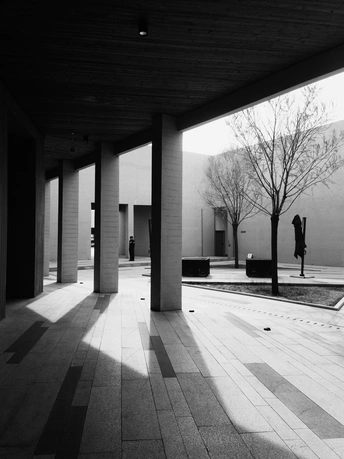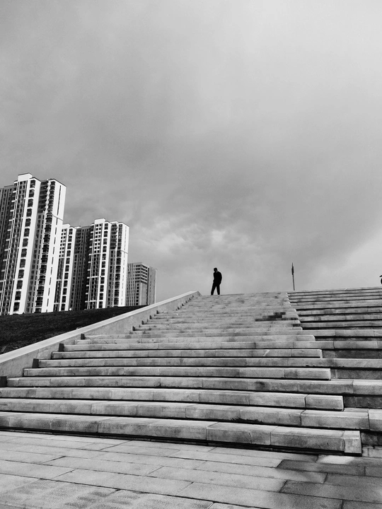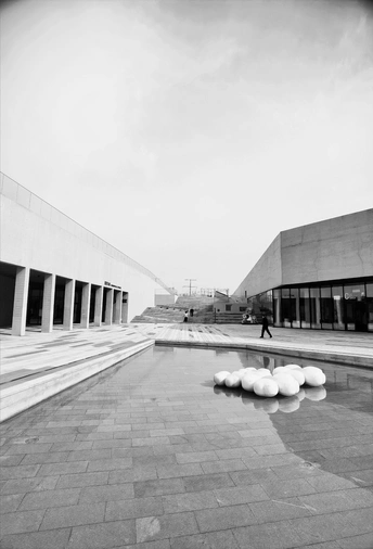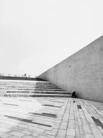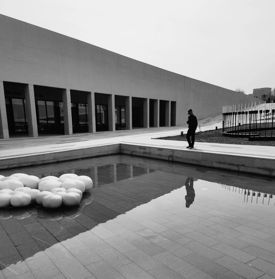 这张照片选择了黑白基调,整体呈现出一种肃穆和冷静的氛围。 **色彩:** 选择了黑白模式,舍弃了色彩信息,专注于光影和形态的表达。处理得当,能有效突出建筑的线条和质感。 **构图:** 构图较为规整,水池的反射增加了画面的趣味性。人物放置在画面的右侧,避免了居中构图的呆板。 **情感共鸣:** 照片传达了一种孤独和疏离的情绪,这与黑白影调和空旷的场景相契合。 **思想深度:** 照片反映了现代建筑的简约风格和人类在其中的渺小感。可以尝试结合更深刻的主题,例如人与自然的冲突,或者城市化进程中的迷失。
