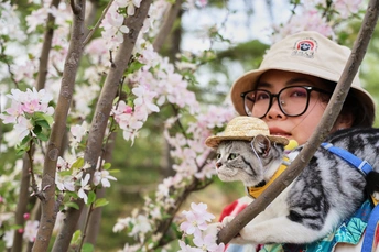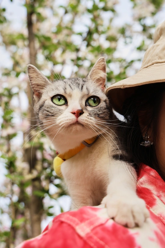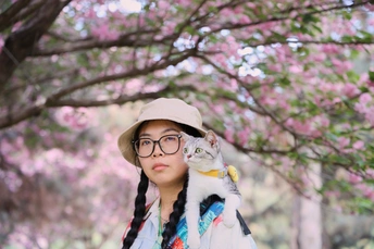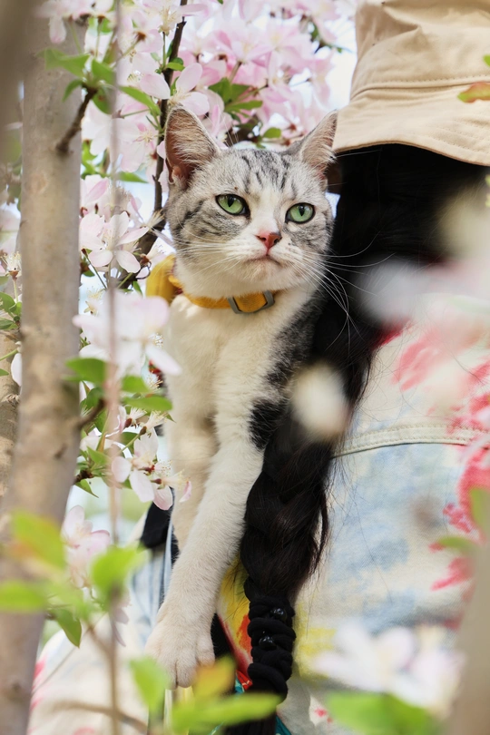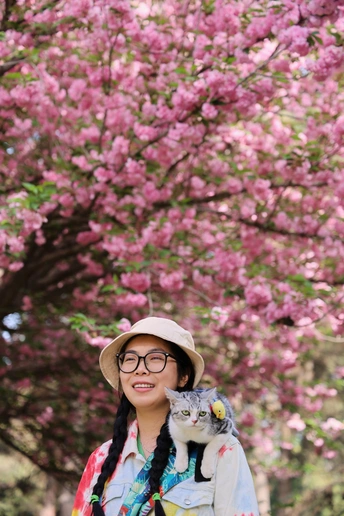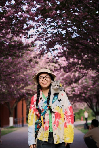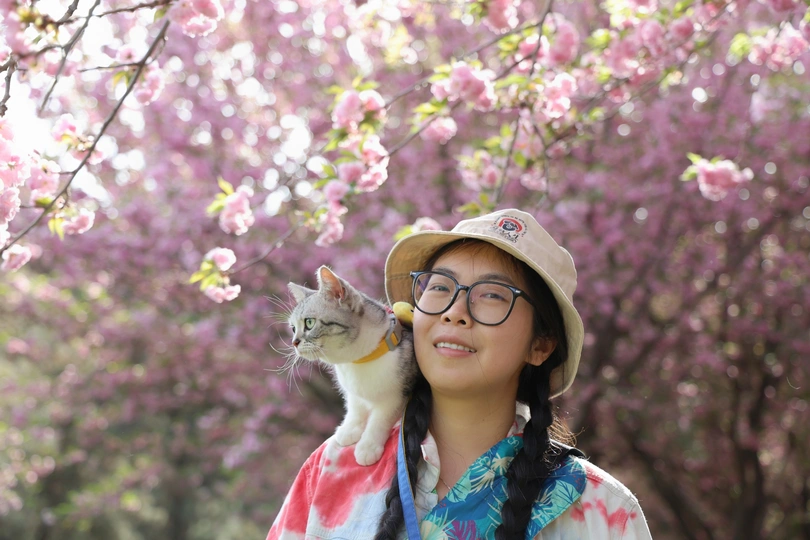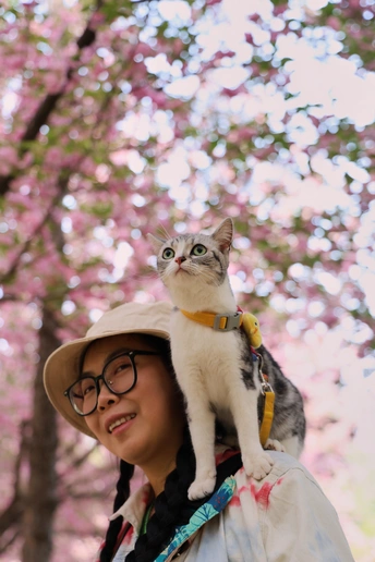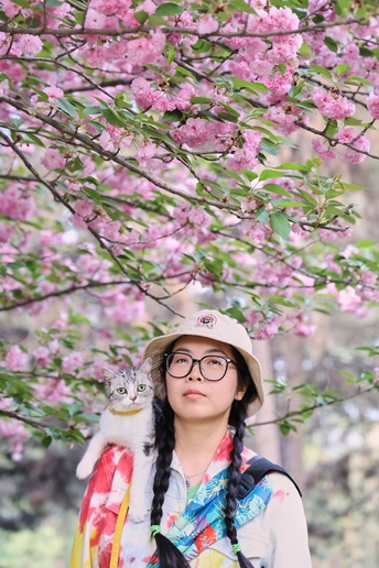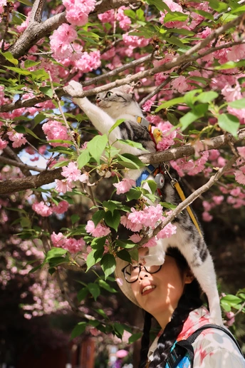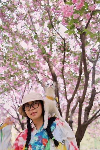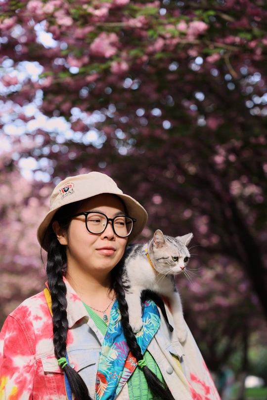 它是虎妞,不管是在家里还是外面,只要有机会它就会爬上我的肩头,在赏花的路上我多了一个搭子。 拍摄器材:佳能R62 24-105 F4 模特:铲屎的和虎妞