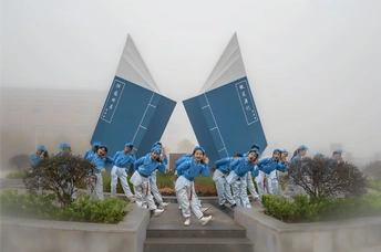 小朋友们在校园田园诗画雕塑前展示国学经典诵读……