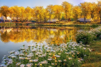 春日暖阳倾洒,湖水如镜,静静倒映着岸边绚烂似火的金黄树林。湖畔雏菊盛放,洁白花瓣在微风中轻颤,似在诉说着秋的温柔。几顶帐篷错落其间,仿佛是通往惬意生活的小小门户