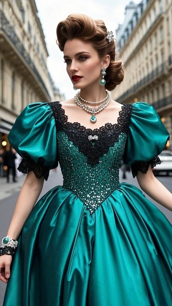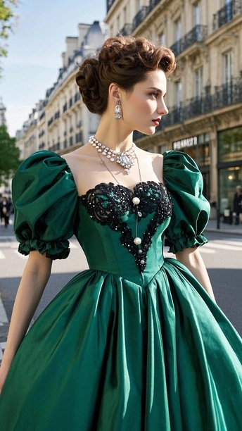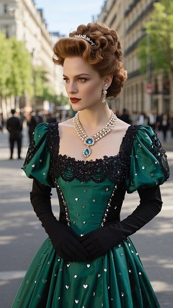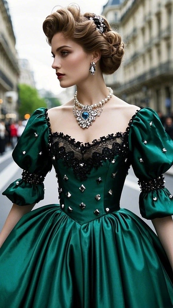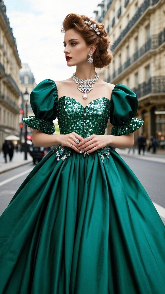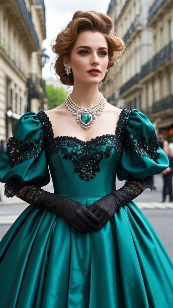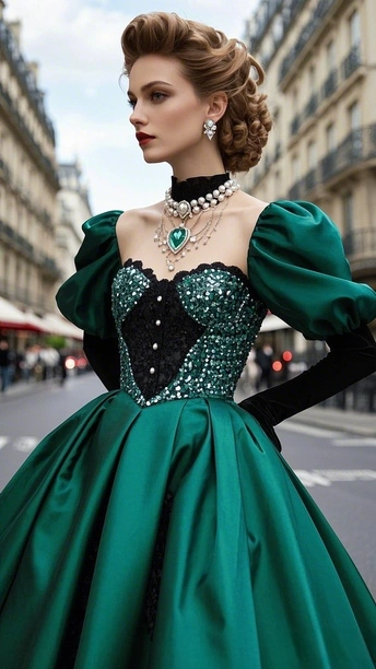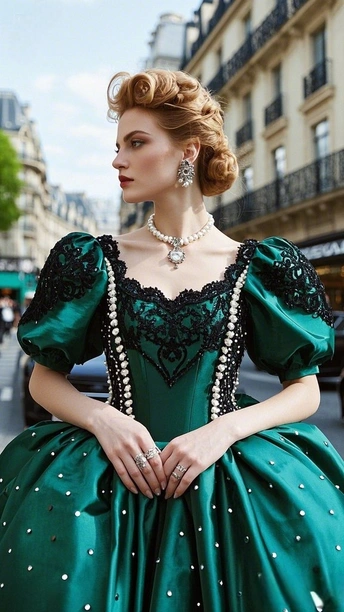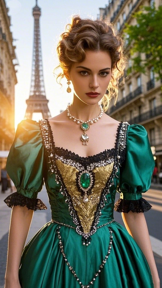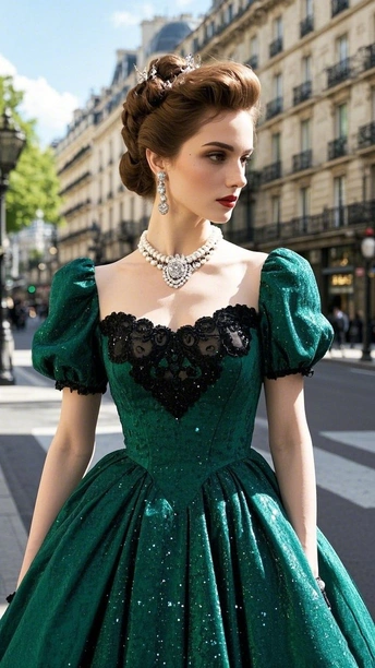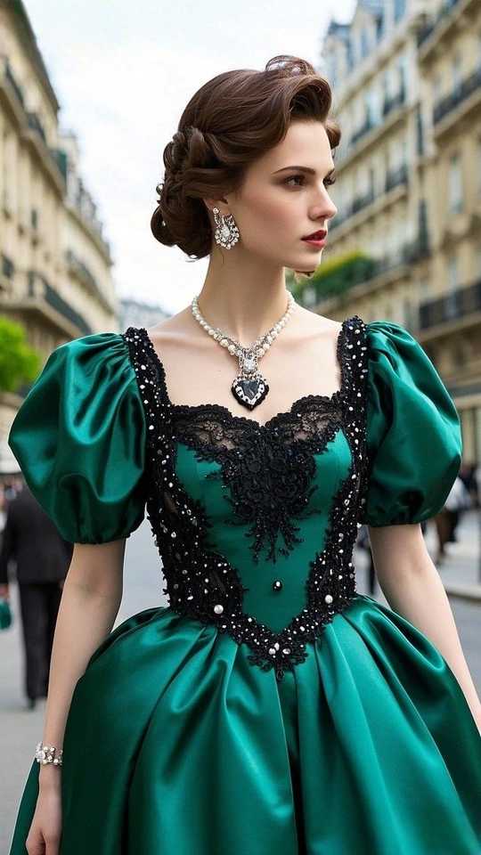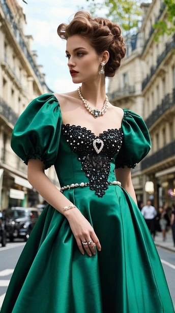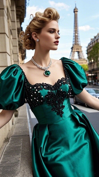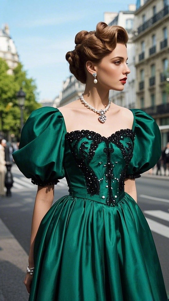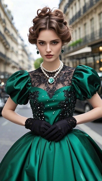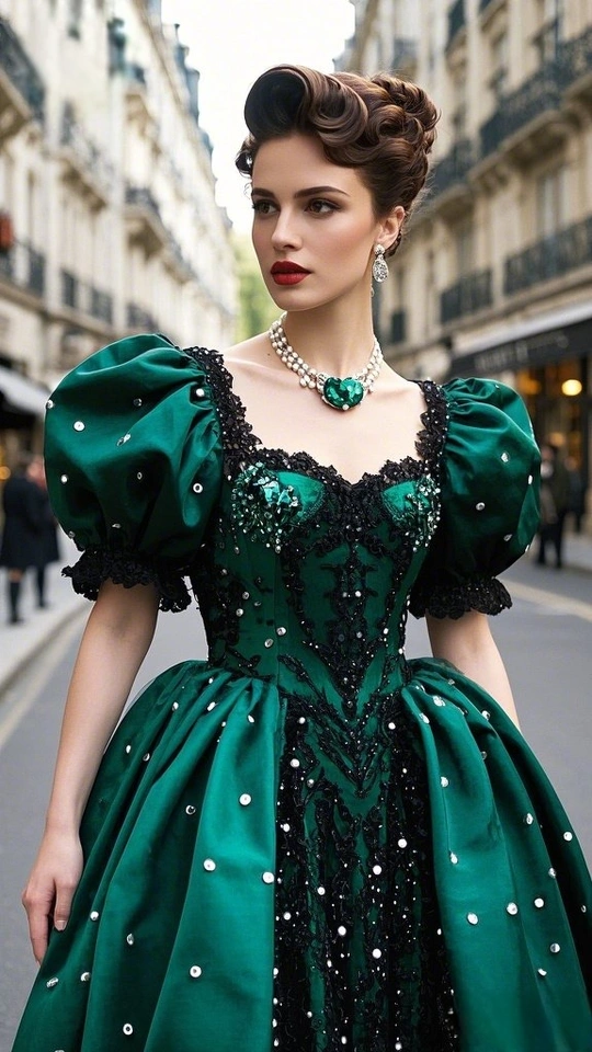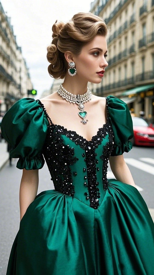 在城市的脉络间游走 一袭幽绿 是夜的眼眸 绸缎轻裹 藏着月光的温柔 泡泡袖间 梦在轻嗅 珍珠串起星子的问候 心形宝石 是灵魂的缺口 镶嵌在颈间 似神秘咒 将时光的秘密 静静收留 发髻高挽 锁住旧时光的流 红唇轻抿 似有故事难开口 于街的转角 遗落一袖风流 那抹绿 晕染在岁月的轴