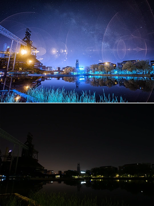 被光污染掩盖的美丽星空-首钢园2025年4月25日:这是长期摄影项目“被光污染掩盖的美丽星空”,每次提供两张照片,一张模拟现场肉眼看到的图景,一张用特殊的拍摄方法展现星空。
