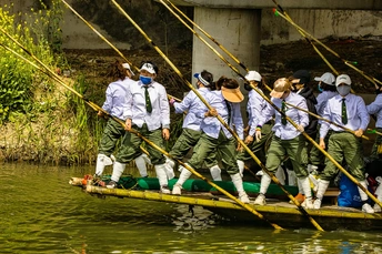 2025年4月4日拍摄于江苏省兴化市茅山会船节。篙子是一种用竹竿或杉木等制成的撑船工具,篙手通过操作篙子来控制船只的航行方向和速度。在古代,篙手的工作条件较为艰苦,需要长时间在水中作业,因此对身体素质和耐力有较高要求。茅山会船是国家级非物质文化遗产之一。会船活动中出现了越来越多的女性身影,她们在赛场上与男性选手一争高下,展现了不输男性的力量和技巧。为古老的传统活动注入了新的活力。尽管撑篙需要丰富的经验和技巧,但女性的参与使得这一传统活动焕发了“年轻态”,也带动了更多年轻人加入这一非物质文化遗产的传承。