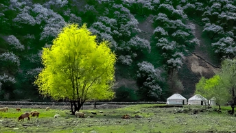 在伊犁吐尔根杏花谷,拍摄了背景山谷中的杏花,中景的蒙古包,前景的树及树下吃草的羊🐑,表现杏花谷静谧美丽的春景。