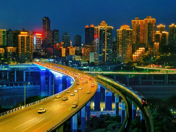 华灯初上闲来无事,到楼顶观看城市夜景,面前的大桥热闹而繁忙,各有功用的大桥承担着各自的职能,汽车大桥金碧辉煌车辆如同归巢的小甲虫飞速爬行,轻轨桥也以快捷的时速运送着游客,江对岸高楼的迷虹灯也点缀着城市的华丽和江景,大都市的夜晚虽是一角也着实迷人。