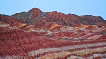这张照片展示了甘肃张掖七彩丹霞一片色彩斑斓的山脉景观。山体呈现出红、黄、白等多种颜色,层次分明,仿佛大自然的调色板。这些彩色条纹是由于地质作用形成的沉积岩层,在光线照射下显得格外绚丽。