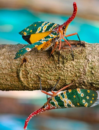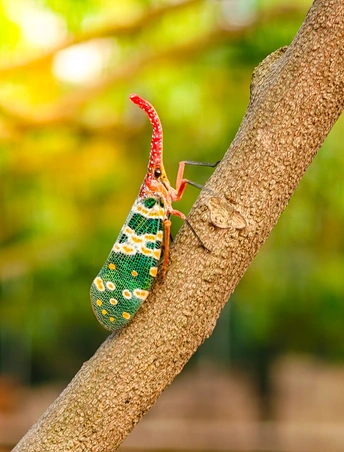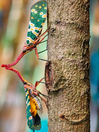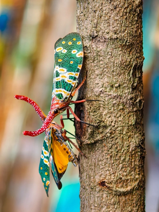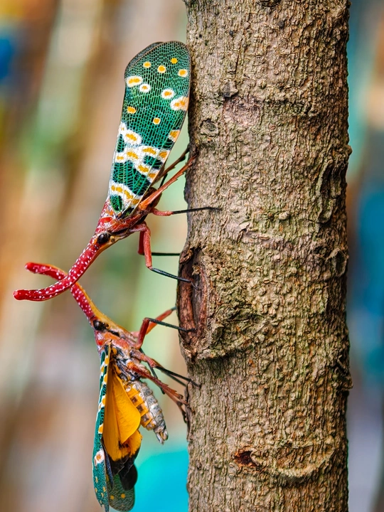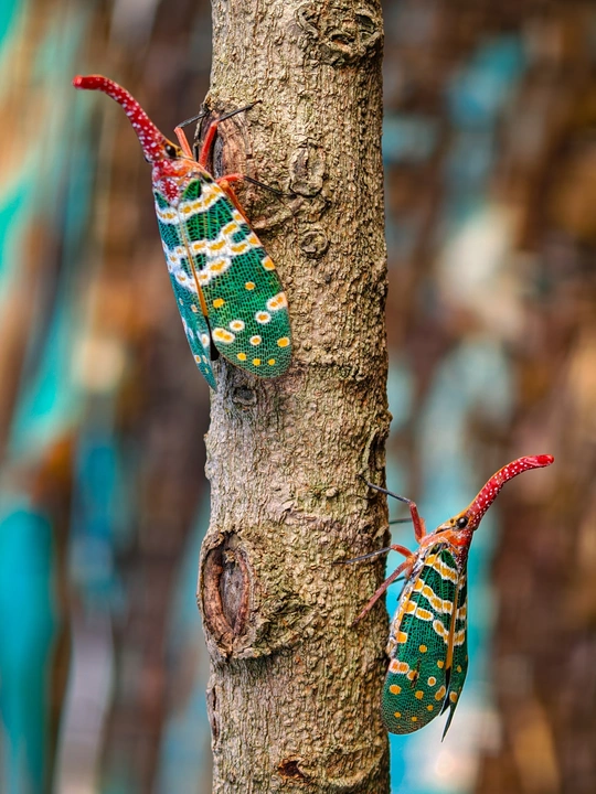 在大自然的舞台上,斑衣蜡蝉宛如灵动的精灵。瞧,它们身披绿底缀彩的华裳,长长的红色喙似精巧的配饰。或静栖于树干,与粗糙纹理相映成趣;或两两相依,似在私语呢喃。每一个姿态,都诉说着属于它们的奇妙物语,在光影交错间,尽显生命的鲜活与美好。
