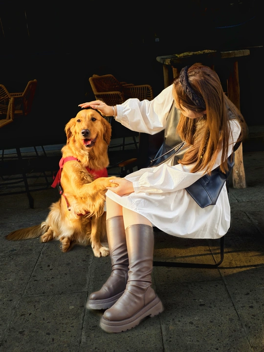 暖色调光线笼罩,女子与金毛犬温馨互动,传递出宁静、幸福情感,让人感受到陪伴的美好 。