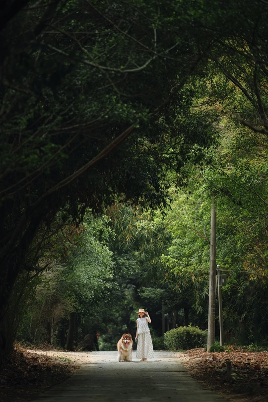夏至未至,步道两旁的树却已绿意盎然。女主人和它的爱宠置身在温柔的光线之中,定格下瞬间的永恒。