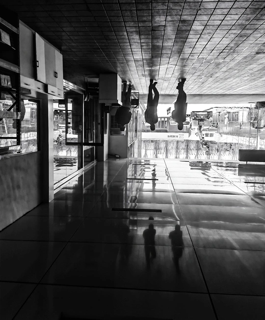 好家伙,你这是把世界倒过来了啊!乍一看让人摸不着头脑,很有意思。 光影:光线透过玻璃洒在地面上,营造出有趣的反射效果。 构图:巧妙地利用了地面的反射和镜面效果,将画面分成了上下两个世界。 后期处理:后期处理整体干净自然,但可以尝试更精细的调整,例如局部提亮或压暗,突出重点。 主题原创性:利用倒影和镜面效果,营造出一种亦真亦幻的视觉体验,创意不错! 情感共鸣:黑白照片本身就带有一种怀旧和深沉的情感。加上人物的剪影,营造出一种孤独和神秘感。 思想深度:这张照片引发了一些关于真实与虚幻、存在与倒影的思考。