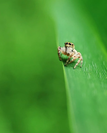 在一片鲜绿的叶子边缘,这只小跳蛛静静栖居。它那毛茸茸的身体、明亮的眼睛,像是大自然精心雕琢的微缩珍宝。在这一方小小的天地里,它或许正感受着微风的轻拂,盘算着下一次跳跃的方向,以它独特的视角,窥探着这个广袤而奇妙的世界。