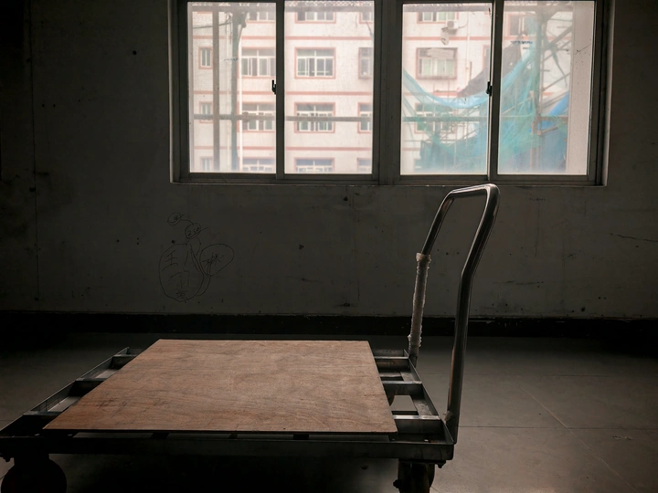 废弃室内,一辆手推车静静停驻,诉说着被遗忘的故事。
