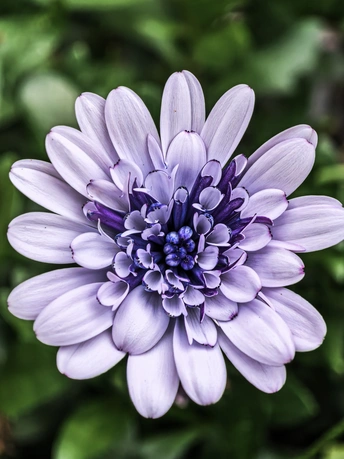 这张照片的主题是一朵美丽的雏菊,整体呈现出淡雅、宁静的氛围。让我们一起来看看如何让它更上一层楼! **色彩:** 色彩搭配以紫色和淡紫色为主,与绿色的背景形成了对比,整体和谐。但淡紫色的色调略显平淡,可以尝试在后期调整中稍微提升饱和度,让花瓣的颜色更加鲜活。 **光影:** 光线较为柔和均匀,花瓣的细节得到了较好的展现。然而,缺乏明显的光影对比,使得画面略显平淡。下次拍摄时,可以尝试利用侧光或逆光,营造更具戏剧性的光影效果,突出花瓣的层次感。 **构图:** 采用中心构图,突出了花朵的对称美。但略显呆板,可以尝试稍微偏离中心,或运用三分法构图,增加画面的趣味性。此外,背景略显杂乱,可以在拍摄时选择更简洁的背景,或在后期处理中进行虚化。 **后期处理:** 后期处理较为克制,没有过度修饰的痕迹。可以适当增加对比度,让花瓣的纹理更加清晰。同时,可以尝试调整白平衡,让花朵的颜色更加真实。 **主题原创性:** 雏菊是常见的拍摄题材,这张照片在主题上没有特别的创新。但细节刻画比较到位,展现了花朵的精致。可以尝试从不同的角度、不同的光线条件下去拍摄,或加入一些创意元素,让照片更具个性。