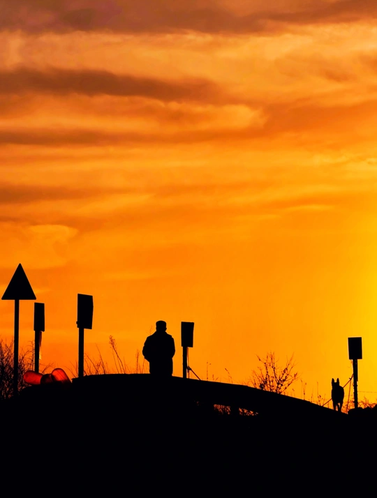 夕阳西下,世界被染成一片暖橙。他静静地伫立在那里,身影被拉得修长。身旁的狗乖巧相伴,似是懂他的沉默。