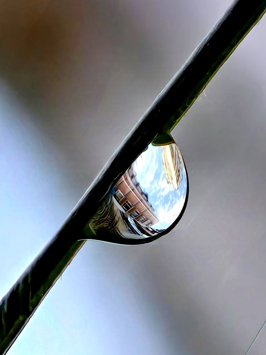 这张照片利用水滴折射拍摄建筑,想法有趣,有“一滴水看世界”的感觉。 色彩上,整体色调柔和,背景灰白与水滴中建筑色彩对比。 光影方面,光线均匀,水滴和植物茎干光影柔和。 构图上,茎干对角线构图引导视线,水滴在画面中心偏左主体突出 后期处理自然,无过度修饰 主题新颖,从微观角度展现奇妙感,引发观者对微观世界的兴趣和对世界、生命的思考。