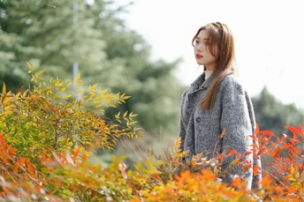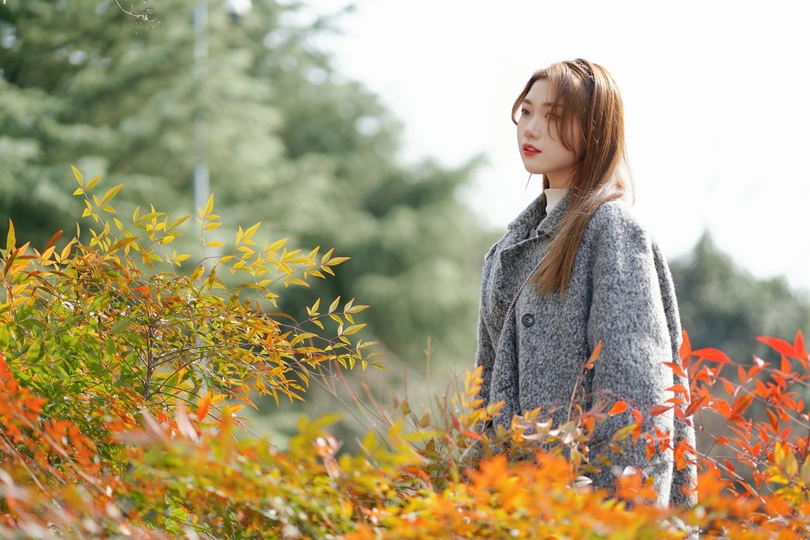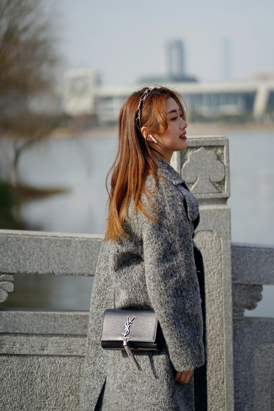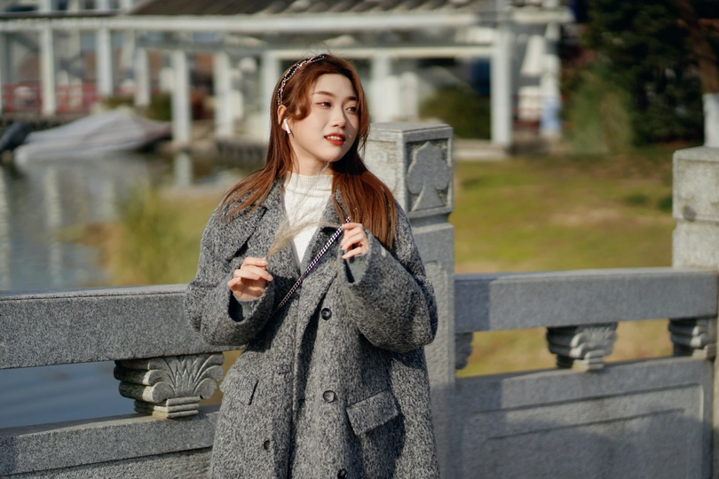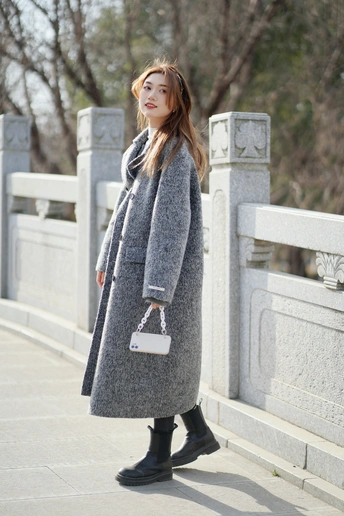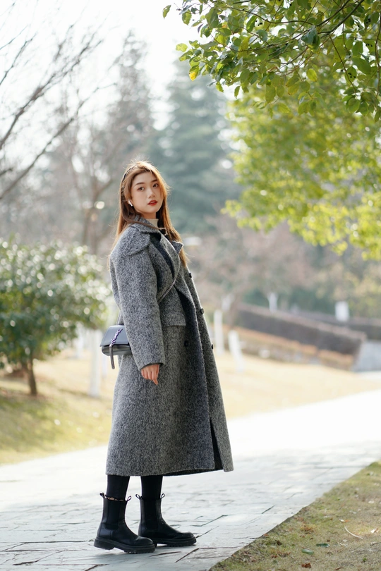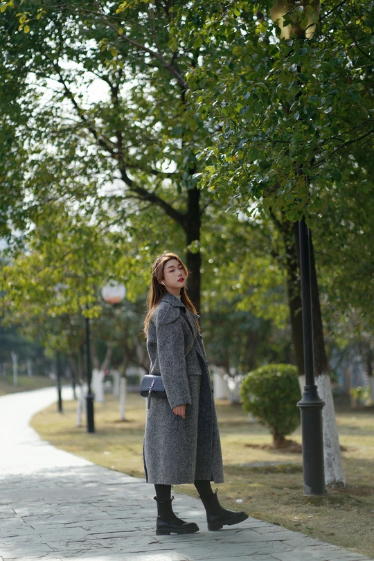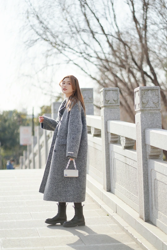 冬日的暖阳下,她身着灰色大衣,优雅地漫步在公园的石桥上。阳光透过光秃的树枝,洒在她的肩头,温暖而柔和。她手提精致的白色小包,黑色靴子与大衣相得益彰,每一步都透露出自信与从容。周围的景色在冬日的映衬下显得格外宁静,她与这静谧的环境融为一体,仿佛时间在这一刻静止,只留下她优雅的身影和冬日的暖阳。