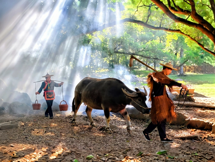 在清晨的晨曦中,观看了一幕农耕与挑水的演奏曲,在丁达尔光的衬托下,显的深洞而富有生活气息,烟火氛围感十足,这就是让人陶醉的田园生活。