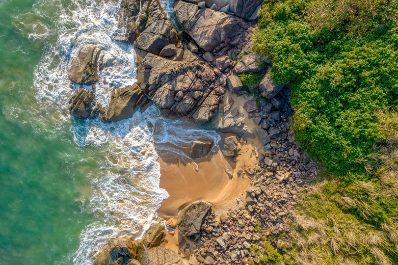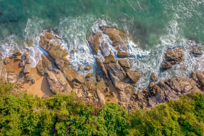 下午时分的石梅湾,是被阳光吻过的调色盘,航拍镜头下礁石是海浪的琴键,白浪是跃动的音符🎶。 层次:海水、浪花、礁石、沙滩、植被 颜色:蓝绿、白浪、中间灰、肤色黄、绿色 坐标:海南万宁石梅湾