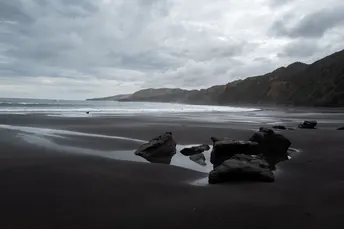 已经有些忘了这两张照片具体的拍摄位置了,在新西兰北岛参观完萤火虫洞后,感觉天色不算晚,便开车一路沿着公路向西行驶,一直行驶到西海岸,遇到了一个长长的隧道,停车下来走过去,遇到了这样一片没有人的黑沙滩,在风暴来临之际独处在这片黑沙滩中,感觉就像来到了世界的尽头