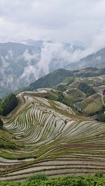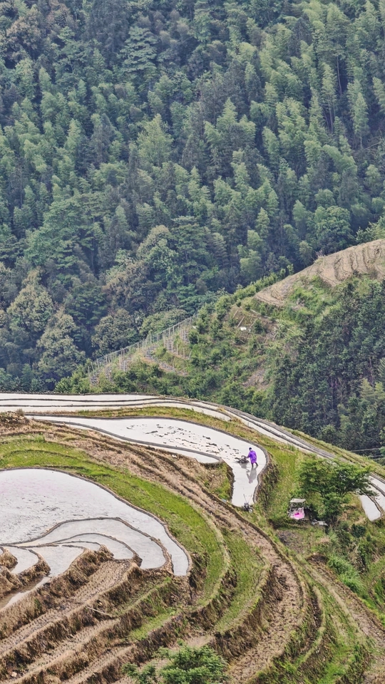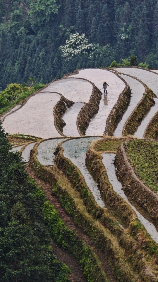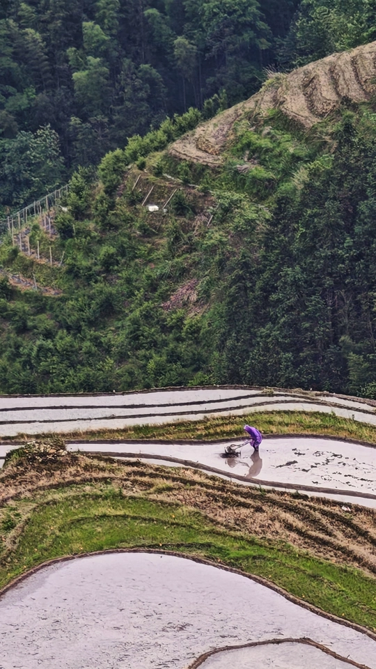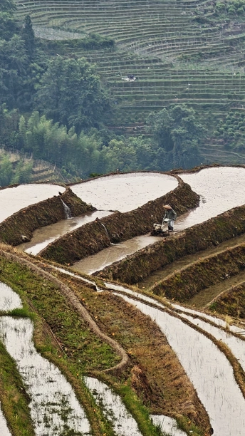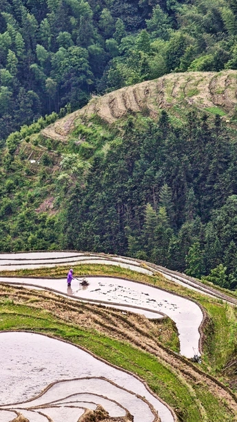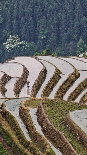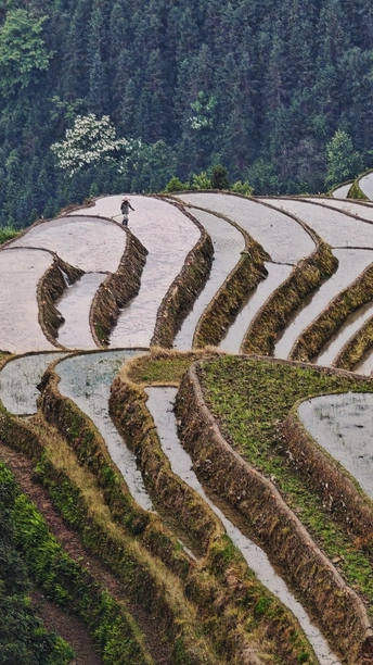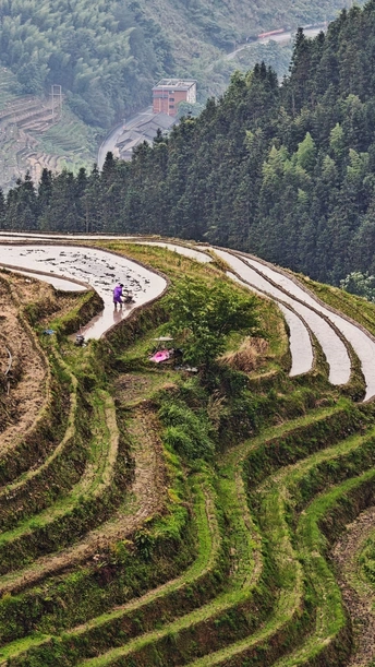 这组图片展现了梯田景观,画面远处一位农民在水田里劳作。梯田线条优美,与周围郁郁葱葱的山林相映成趣,还有点缀其间开着白花的树和小屋 。这样的场景展现了乡村田园生活的质朴,以及人与自然和谐共处的画面。