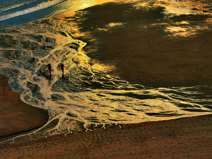 在傍晚的海边沙滩,不仅微风习习清凉益人,而且迷人的水纹线在夕阳的照射下,金光闪闪,如同流动的金子一样,使风景无法替代。