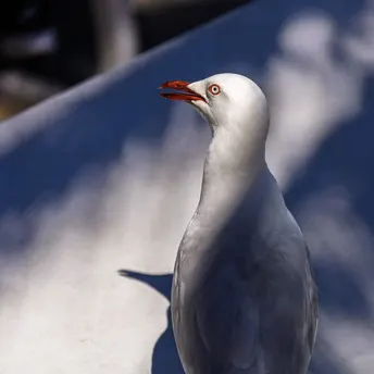 这只海鸥静静伫立,洁白的羽毛在光影交错中更显纯净。橙红的喙微微张开,仿佛在轻声诉说着大海的故事。那明亮的眼睛,透着灵动与好奇,似在打量这世间的一切。在光影的勾勒下,它宛如一幅静谧的画,独自享受着时光的悠然,也成为了这瞬间最美的风景。
