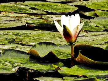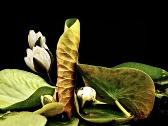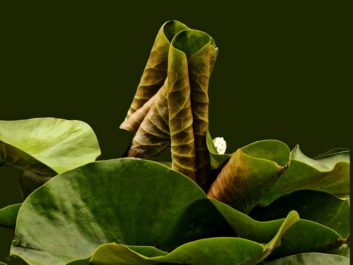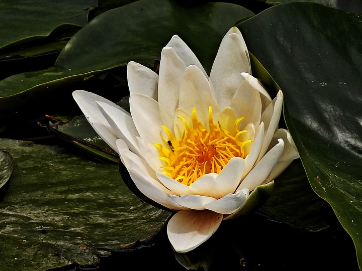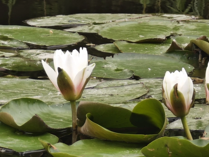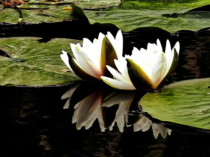 在幽谧的水面,睡莲悄然绽放。洁白花朵与翠绿叶片相依,于暗影中散发着宁静而优雅的气息,似是藏着一汪静谧的梦。