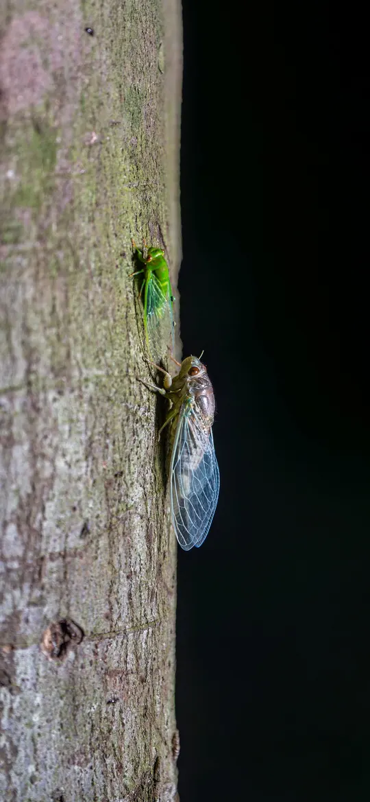 在夜的静谧里,树干成为蝉蜕变的舞台。一只翠绿的蝉新生,翅翼透明,透着生命的蓬勃;另一只完成使命,身躯略显黯淡。它们是夏日的歌者,用短暂却绚烂的生命,奏响时光的乐章,诉说着破茧成蝶般的坚韧与新生。