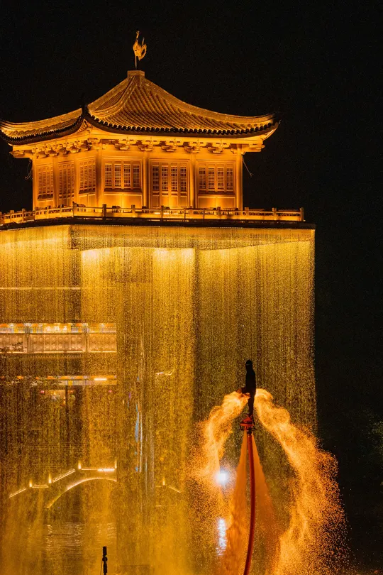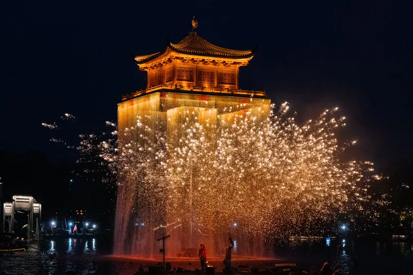 画面定格铁水腾空的刹那,1600℃的高温熔液被匠人奋力击打,铁屑如星雨洒落,与婺女洲抱玉塔的蓝色琉璃顶交相辉映。这一瞬的璀璨,既是辛弃疾笔下“东风夜放花千树”的浪漫重现,也是千年非遗技艺在夜空中的极致绽放。