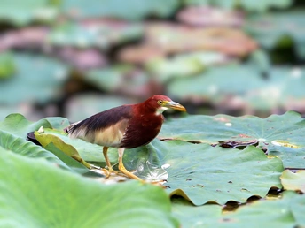 荷塘里池鹭在荷叶上紧盯水下的目标,耐心足足!